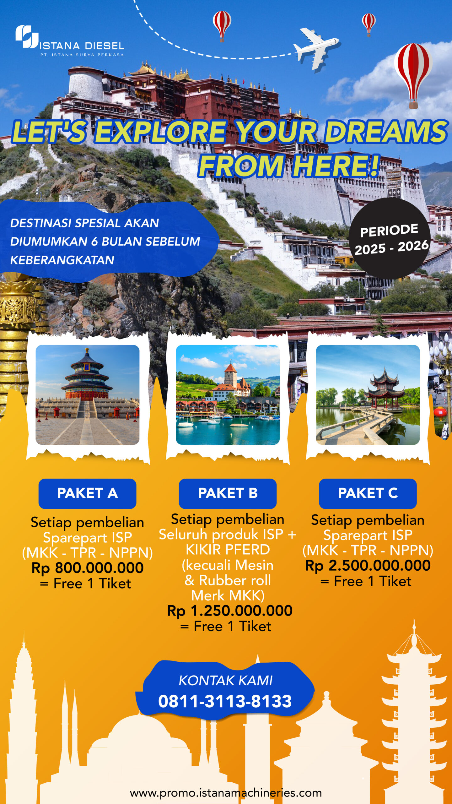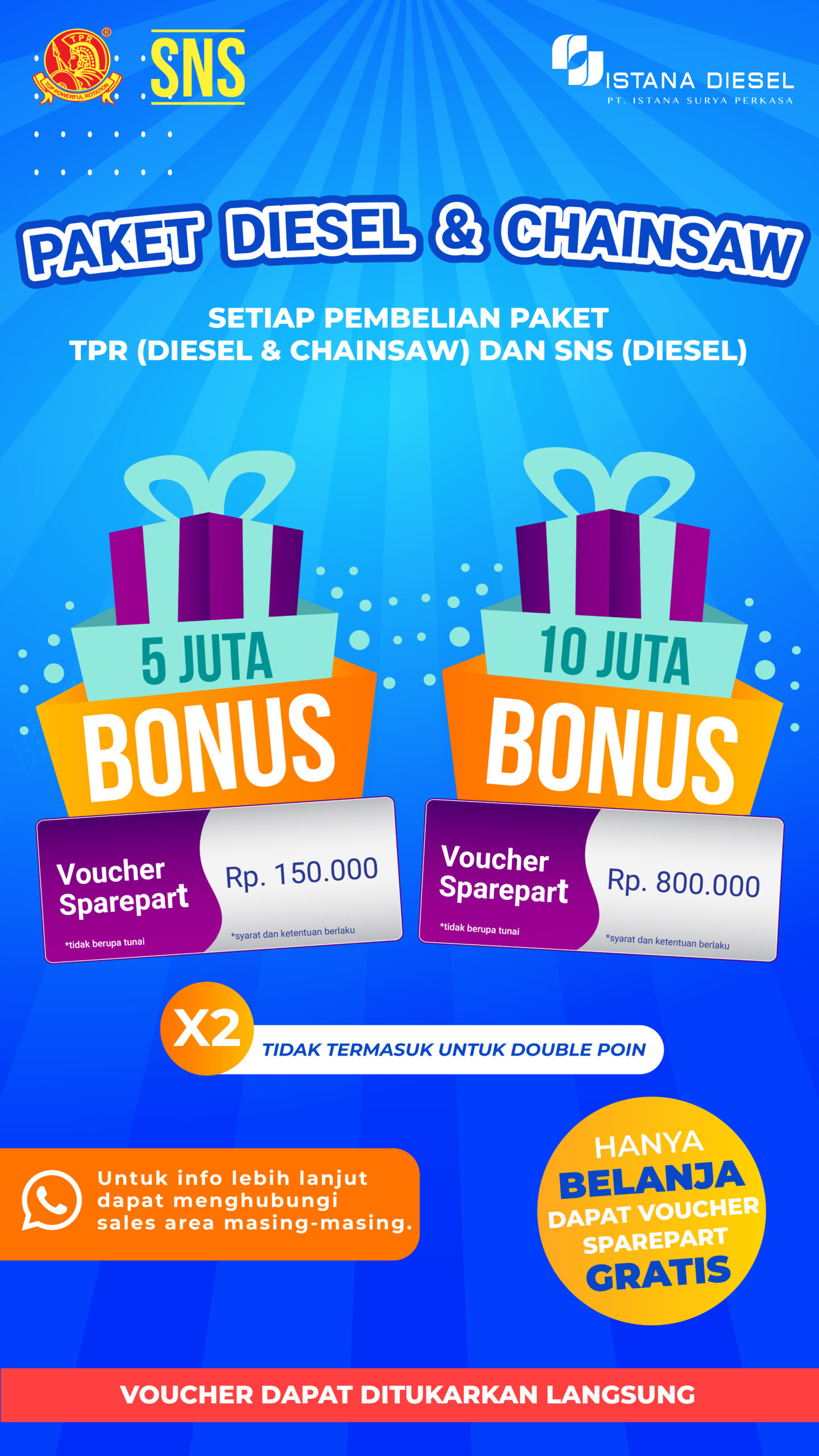 Program ekslusif untuk customer setia PT. Istana Surya Perkasa untuk pembelian sparepart & mesin akan mendapatkan reward. Untuk info lebih lanjut dapat menghubungi sales area masing-masing.